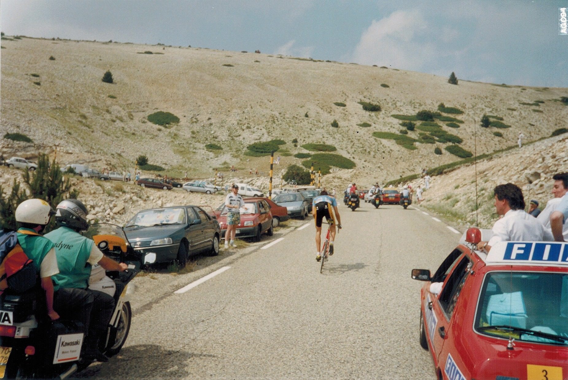 “From this spot, we waited for the riders. A fan had a radio so was providing updates and we knew that Eros Poli was the sole breakaway rider. Fans went crazy upon hearing that he was starting the lower slopes at Bedoin. We could finally see the giant figure of Eros laboring away on the pedals. He was going so slow we thought he was either going to crack or get caught. Fans yelled words of encouragement. It was amazing. Minutes later, Pantani, Indurain, De La Cuevas, Virenque, Zulle zipped by. It was a total madhouse by then. Someone yelled out that the radio had just announced Eros Poli had survived and won. Everyone cheered, some cried and we watched the rest of the riders lumber by. What a day.